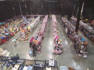 Kristen started the sale 6 years ago as a new mom, when she set out to find an exersaucer for her son that wouldn’t cost her a Benjamen (that’s slang for $100, yo.)   Garage sale-ing proved challenging with a newborn, so she held the original sale in her driveway with 30 of her friends (like a giant swap of sorts) and it’s “grown like hotcakes ever since!” Hotcakes, it seems, is an understatement.   The fall sale filled an airplane hanger.