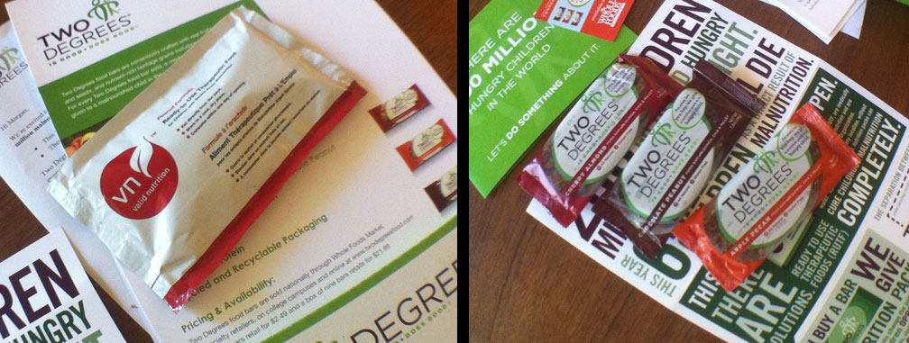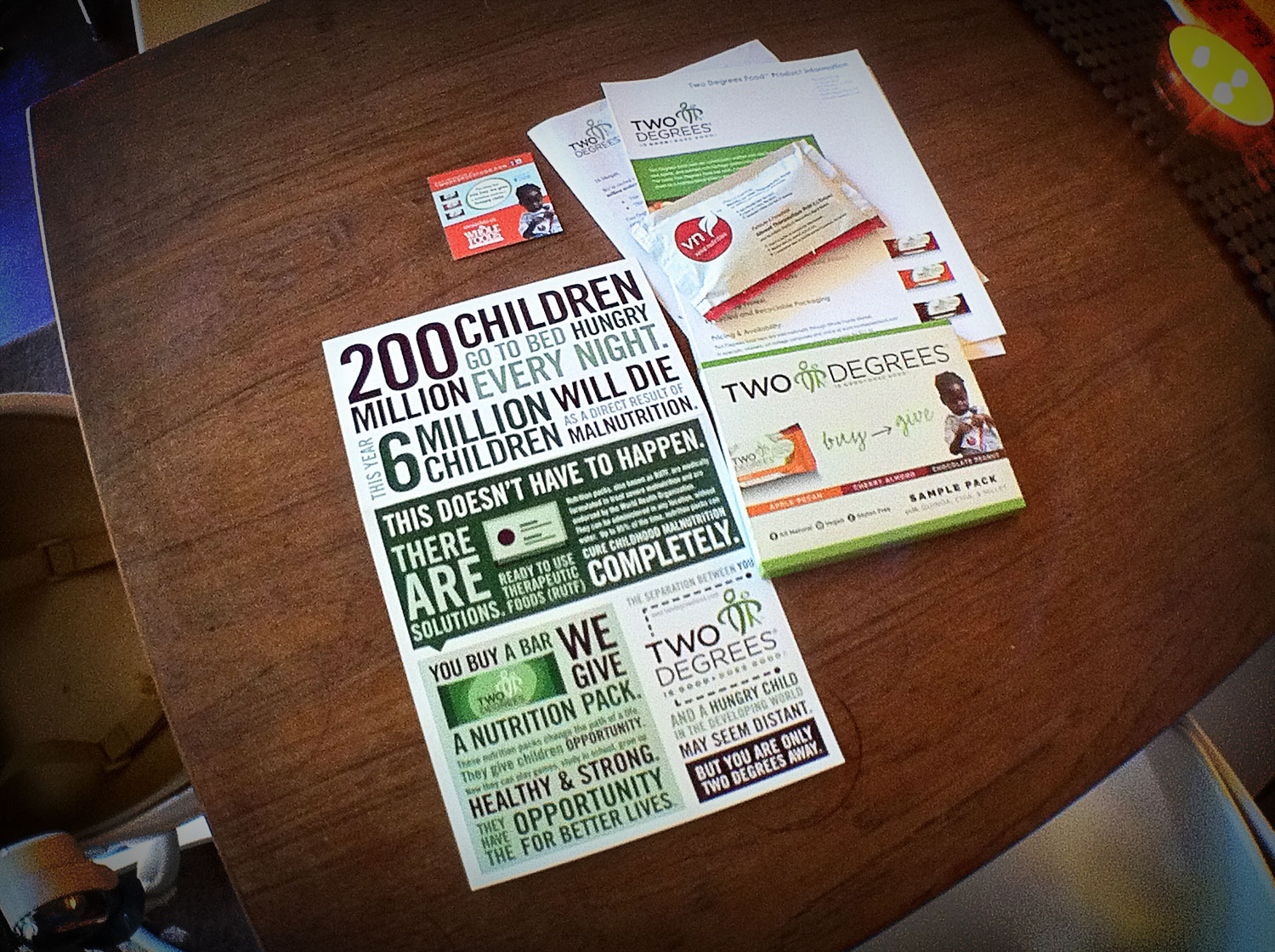 And I was pretty floored. A meal bar for me = a meal for the hungry? Dee and I busted open both the Bars (delicious, addictive, amazing) and the nutrition pack that Two Degrees so wisely sent…because you know I wanted to know what kind of nutrition my shopping at Whole Foods was going to get kiddos in need…which, well…see for yourself.
