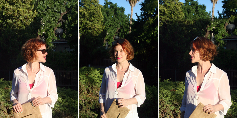 The ladies checked in to make sure I would be comfy wearing a “hot pink bralette” under a sheer white top to add a pop of color to my party outfit. I wasn’t totally sure, but said I’d give it a go. In the end? I felt great in it — totally sassy and not at all exposed. Although I probably wouldn’t rock the look for parent’s night at Dee’s preschool, it definitely put me in the right mindset to be social at a cocktail party.